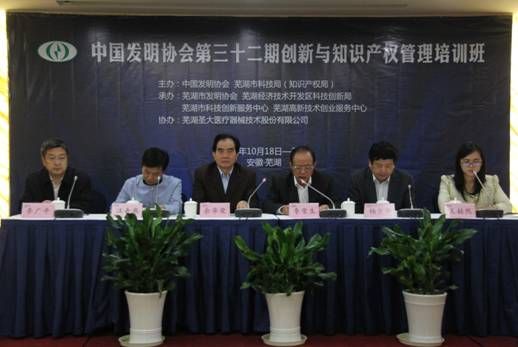 中國(guó)發(fā)明協(xié)會(huì)第三十二期創(chuàng)新與知識(shí)產(chǎn)權(quán)培訓(xùn)班于2016年10月18-21日在蕪湖市成功舉辦,中國(guó)發(fā)明協(xié)會(huì)常務(wù)副理事長(zhǎng)兼秘書(shū)長(zhǎng)余華榮出席開(kāi)班儀式,蕪湖市科技局局長(zhǎng)楊少華,副局長(zhǎng)李廣平,安徽信息工程學(xué)院黨委書(shū)記汪奇燕、蕪湖市發(fā)明協(xié)會(huì)會(huì)長(zhǎng)李榮生等領(lǐng)導(dǎo)參加開(kāi)班儀式。